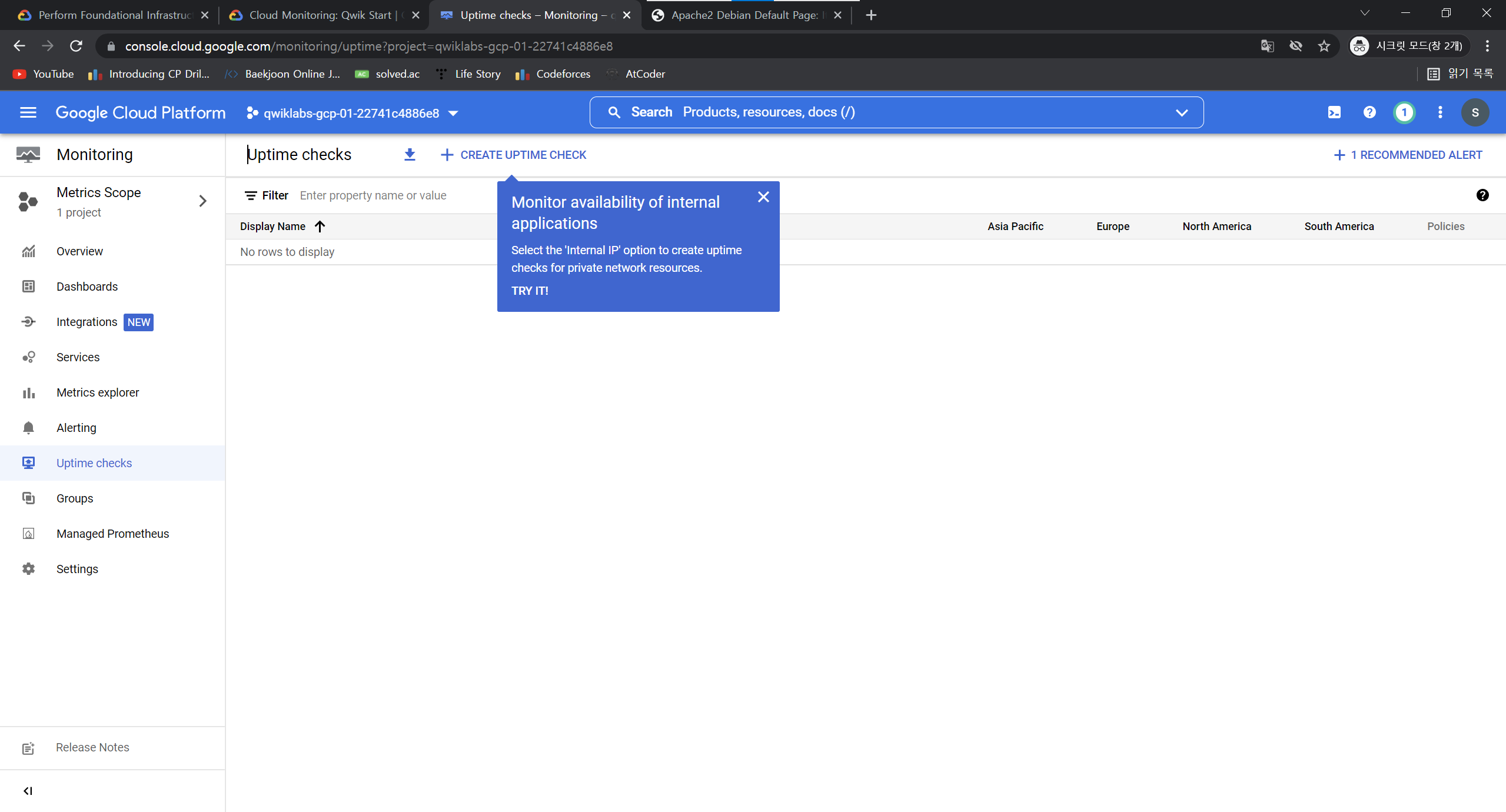 그리고 Monitoring 탭에서 resource가 언제나 접근가능한지를 확인하는 uptime check를 만들어준다.